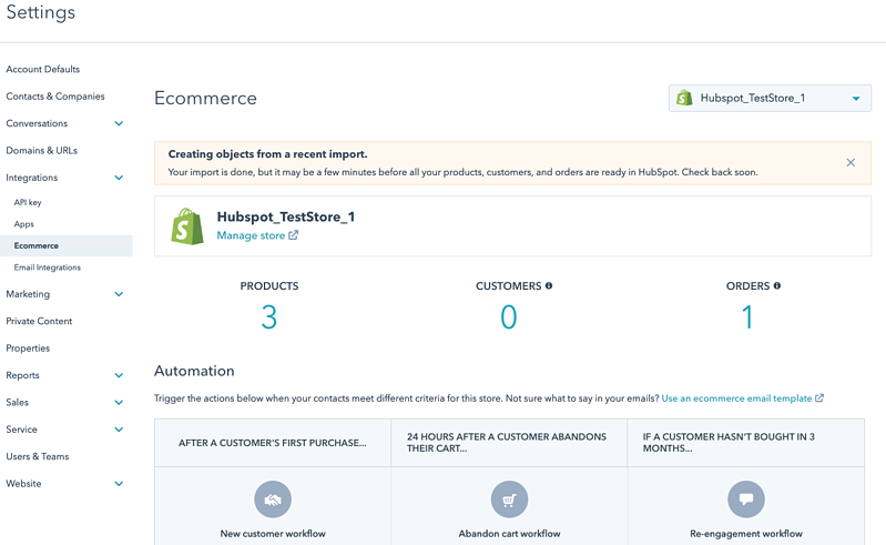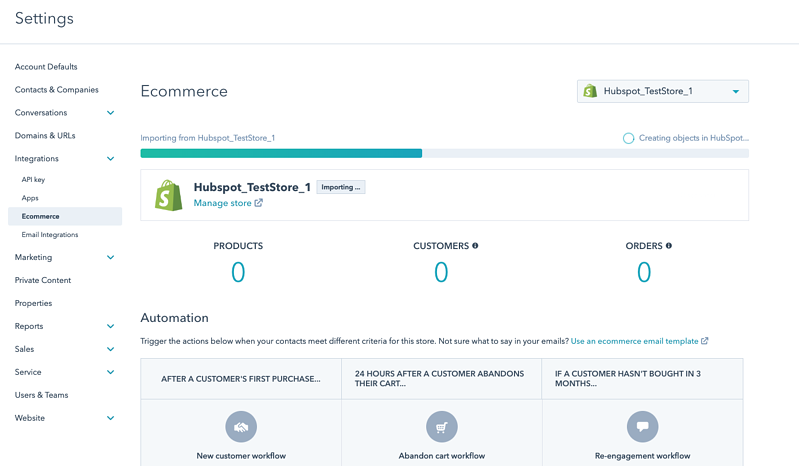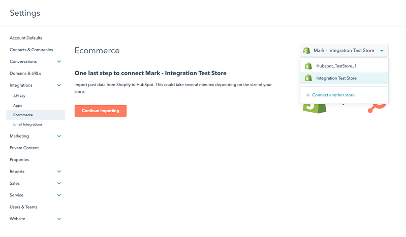After a user connects you app to HubSpot, the user will see a "Continue importing" button when viewing the details for the store in their Ecommerce settings. They'll also have the option to view the details for a different store, if they have multiple stores set up.