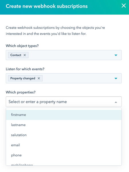 Select the object type (i.e. contact, company, deal) and event type (i.e. creation, change, deletion). Note: Deleted for privacy can only be selected when "contacts" is the only selected object type.